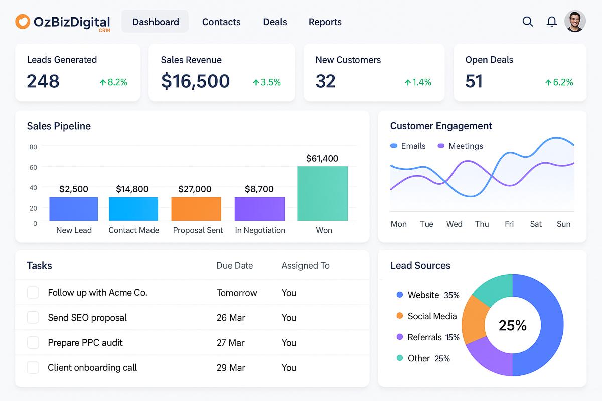 Imagine a business where no lead slips away, every client feels valued, and your time is spent growing instead of chasing tasks. OzBizDigital’s CRM makes it possible, helping you connect better, work smarter, and turn opportunities into wins.